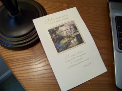 While looking for something in my small writing desk early this morning, I came across a beautiful card someone had sent and which offered blessings for my new home. Obviously I had received it the past spring. Having forgotten the sender, I opened it with curiosity, and it was as if a light came out of the card. I swear this was so.