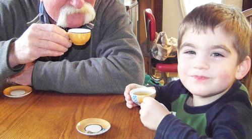 Three days after my somewhat confused attempt, which I thought had made no impression whatsoever, he spied my mother’s vintage child’s tea dishes in the china cabinet. He called, “I wanna have a tea party,” and proceeded to open the china cabinet, which he had never done before, and pull out the dishes.