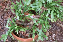 A few days later, I checked again. The new growth was not like anything I expected. It was triangle in shape, a sort of mutant looking thing. I watered it, just in case and forgot it again for weeks. The next time I looked I saw more of those little triangle nubs had appeared, and then–definite leaves! By the middle of summer, I moved the plant back to the courtyard garden. This year it is beginning to actually be pretty again.