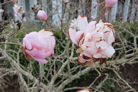 My Loebner magnolia has been putting out blossoms and getting nipped back for a few weeks now. The ugly burnt ones fall off and we start over. The same with daffodils and hyacinths — a good thing everything doesn’t burst out at once when we have warm spells.