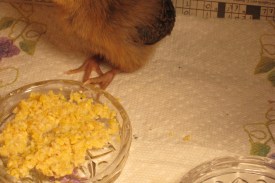 By Wednesday morning, Puny was observed putting her foot on her crystal feed dish. Thursday, when we moved all the chicks to the new chicken condo, she was hopping around.