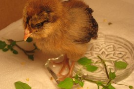Well. I read some happy Valentine’s day sharing and thought: blah! I’m in a bad mood. It is over these *$#! chicks. I had no idea of all that would be involved! I had no idea of how complicated I make everything, and how much I had to learn– and all Again! How many times have I done this in my life? I want to back up and have a do-over about these chickens. This morning I noticed a couple of runny poos. Yikes! Of course there is no telling from which one. Maybe they have the dread disease that I cannot pronounce and all because I did not use the medicated feed, that a number of people told me I did not need. People have told me all sorts of conflicting advice. And I’ve discovered that keeping the flock in a wire cat carrier similar to the ones as the feed store that looked so ideal has a large drawback. One can only get in it through a side door. Getting harder and hard to clean the dang cage with the chicks in there. They scramble around in a hazardous manner, and are very hard to catch from the side angle. They fly and flap all over, likely to get injured. One chick, who I’ve been concerned about for days as she is not growing and thriving like the others, got a hurt leg. Or had a stroke, I don’t know. All I can tell is that her right leg and foot is not working, and let me say that a chick cannot hop around on only one leg. I had to separate her out, expected her to die, but she did not. So now I have a stupid one-legged chick, still peeping, in a little box, with my desk lamp for heat, eating and drinking out of my grandmother’s cut crystal ice tea coasters.