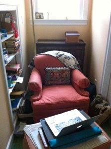 I’m writing this in the sanctity of my office, in the comfy chair in the nook of my narrow dormer. My door is open, and voices float up from below–five-year-old grandson and husband in conversation. They are discussing the weighty matter of former pre-school friends going to their respective schools just as grandson is going to his.
