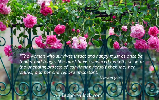 When I read this quote from Maya Angelou, it occurred to me that all of my heroines are doing this: living in an unending process of believing that she and her values and choices are important. This is a process in my own life. The world wants us to have it’s values and choices, but it is vital we each know and stand by our own. This is living our lives with faith in who God has made us to be.