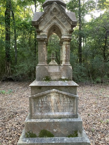 Think of it, the stories these old trees, gravestones, monuments, fences could tell. Sometimes I feel the land holds the emotions, the sorrow but also the wonder and respect, too, for the people who were born and lived through their times, having failures and victories, making their mark. Harrison Lassiter’s mark is still there, having weathered storms and neglect, outliving those who erected the elaborately carved and surely costly monument one hundred and thirty-seven years ago in 1886, in the tiny town of Forkland, Alabama.