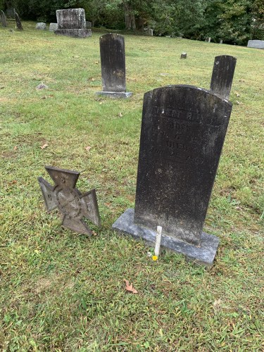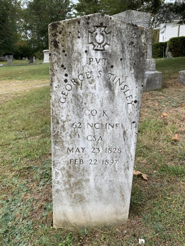 Both gravemarkers bear the emblem of the Confederate States of America, NC INF. Private Tinsley, on the right, lived through the Civil War. When enlarging the picture on the left, I can just make out that the person died in 1863, which would’ve been the first year of the war. I would’ve liked to clean the marker, I have my supplies, but there was no one to ask for permission.